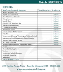 - Rent/Buy and Costs: Different senior living apartments have different financial business models. Understanding the implications of a buy vs. a rent decision is one component, amenities and services included in the rental rate is another. Be sure to conduct a comparison and have a clear picture of what are “musts” vs. “nice to haves” to make the best decision. Below is a list we created to of the items to take into consideration. Feel free to click on the document and download or print for your use.